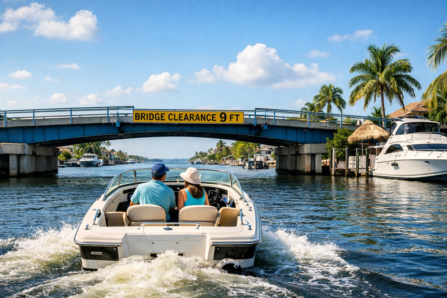 Boats that typically fit: 26+ foot center console boats, boats with removable T-tops, and many cabin cruisers regularly navigate these bridges. You might need to lower fishing poles or fold down a radar antenna temporarily, but it's doable.